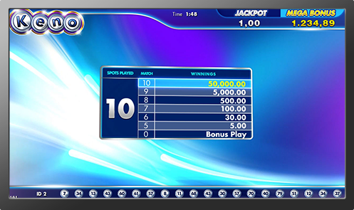 Keno is a lottery-like gambling game played every 4 minutes. Players wager by choosing numbers ranging from 1 trough 80. Once the game starts, 20 numbers are drawn at random, paytable varies depending on how many numbers player has selected.